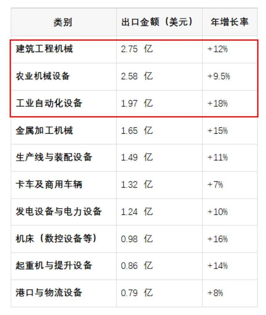 中国对巴西十大出口行业中,机械取工业设备位列前三,包罗数控机床、液压系统和从动化节制器。据第一财经统计,2024年巴西进口中国工控产物中,电机零部件增加30%,传动设备增加25%。