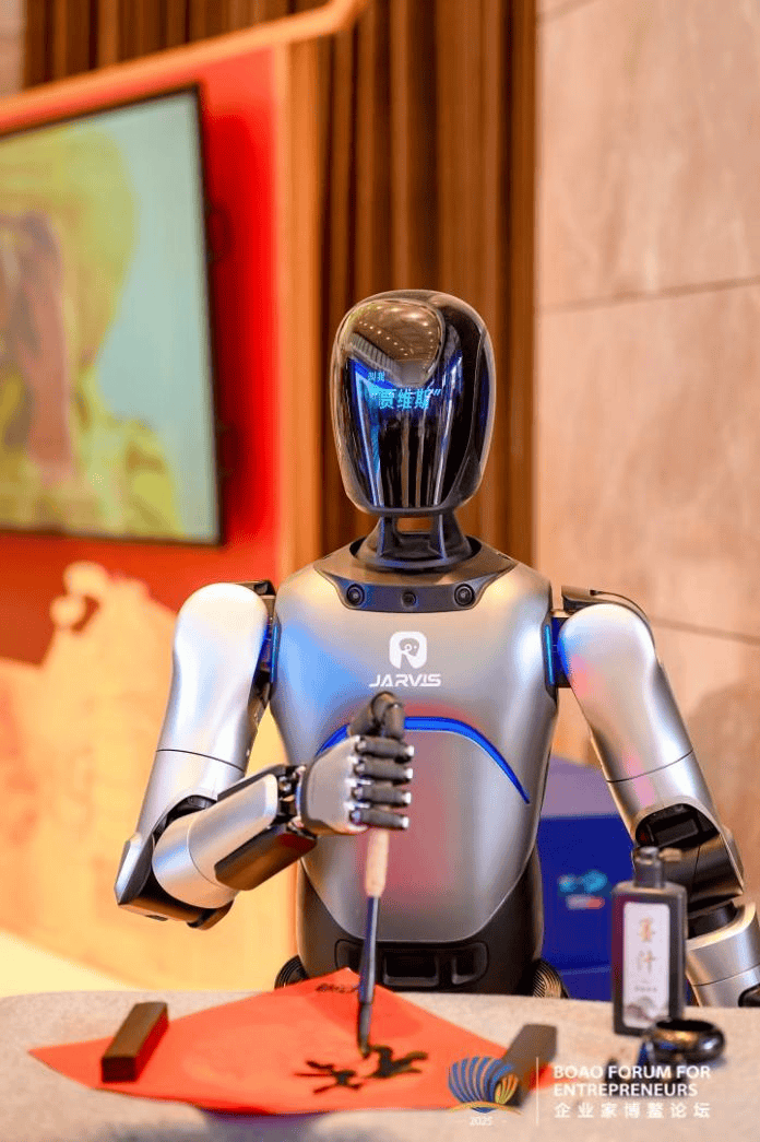 正在2025企业家博鳌论坛现场,贾维斯展现了其极具人文质感的一面,正在现场挥毫泼墨,创做书法做品赠予宾客。